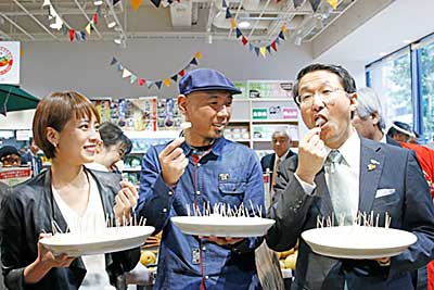 地震の影響で、収穫前の多くの梨が、地面に落ちてしまうなどの被害を受けたことについて平井知事は、「残念ながら地面に落ちた梨は市場では売れないですが、味は美味しいです。皆さんのまごころで買っていただけませんか。そして、地震を乗り越えた梨を〝災い無し(梨)〟のお守りとしてぜひとも買っていただきたい」と述べた。プロモーション後の梨の試食では、同館を訪れた人たちに、知事自ら鳥取県の梨について情報提供を行った。
