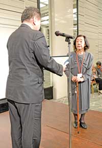 パーティーの席では、「プロが選ぶ日本のホテル・旅館100選」の選考審査委員を長年務めたことに対し、旅行新聞新社から絹子夫人に感謝状と記念品が贈られた。
