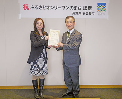 NPO法人ふるさとオンリーワンのまち(津田令子理事長)は2011年の発足以来、独特の風土や伝統文化、産物、無形のおもてなしなどユニークな観光資源を、「ふるさとオンリーワンのまち」と認定している。3月8日には、長野県安曇野市(宮澤宗弘市長)を訪れ、同市の「地域ブランドを活かした人づくり、モノづくり、まちづくり~新たな取り組み『朝が好きになる街 安曇野』の展開~」を第8号として認定。津田理事長が宮澤市長に認定書を授与した。