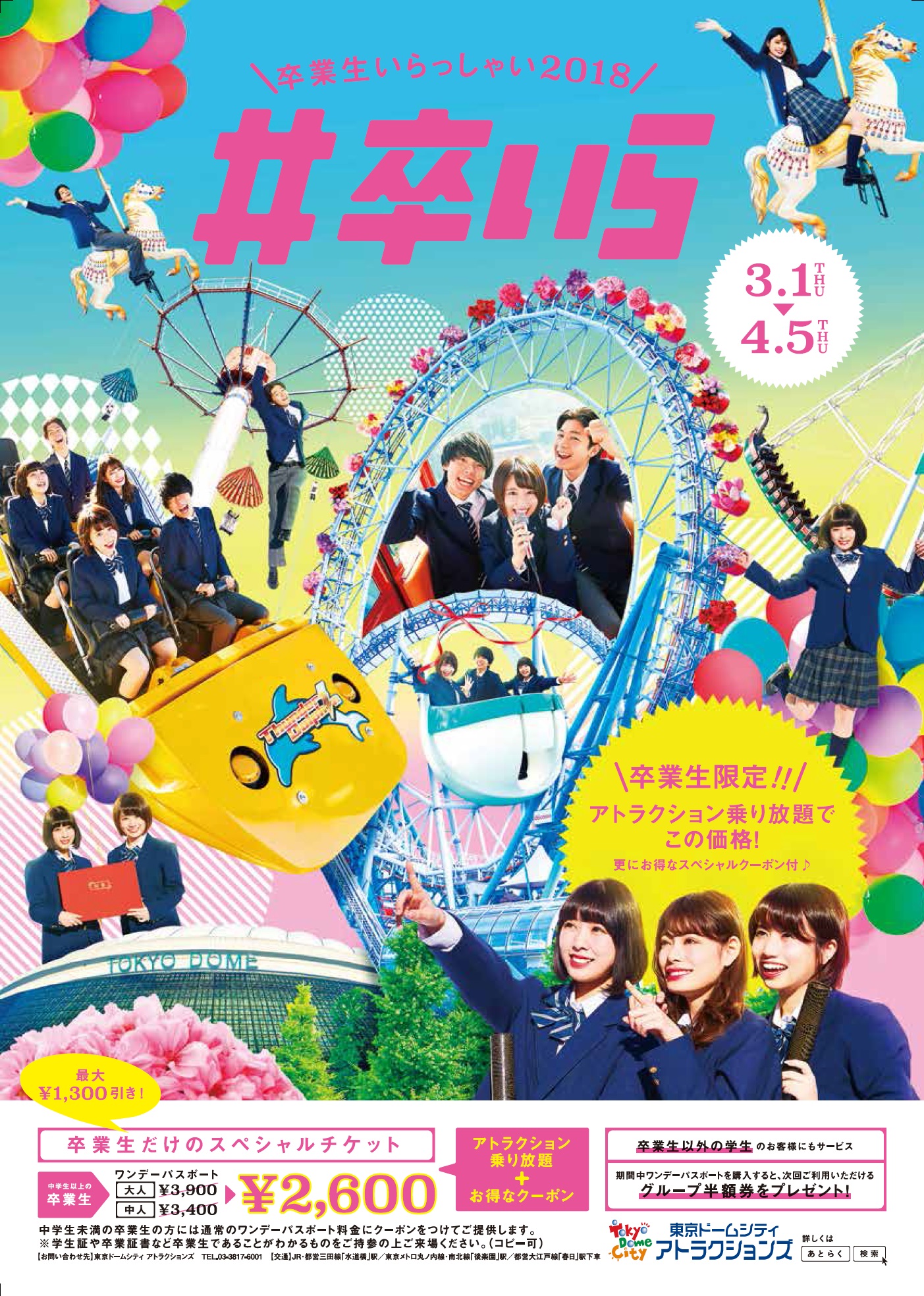 東京ドームシティアトラクションズは3月1日(木)~4月5日(木)まで、2018年春に卒業を迎 える学生を対象に「卒業生いらっしゃい2018 #卒いら」を開催。アトラクションや東京ドームシティ内の各施設・店舗がお得に楽しめる。