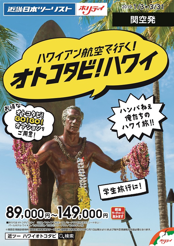 近畿日本ツーリスト関西はこのほど、海外企画旅行商品「ホリデイ」で「ハワイアン航空で行く!オトコタビ!ハワイ」(関空発)を売り出した。男性をメインターゲットとした新商品で、「女性やファミリー、ハネムーナー向けの旅行先」というイメージが強いハワイへの送客拡大をはかる。