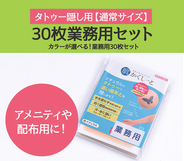 グランブルー(千葉市)が販売する「肌かくしーと」はタトゥーや傷あとなどを隠せる、肌に貼るタイプのスキンカバーシートです。このほど旅館ホテル向けに業務用30枚セットが発売されました。極薄0・02㍉のシートで、汗や水に強いほか、貼る時に水が不要なのも特徴。パッチテスト済みなので安心して使えます。サイズは通常判と大判の2種類です。