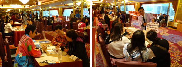 進行はまず、旅館側を紹介したあと、商談を約2時間、ティータイムを取りながら行われた。会場は、参加した13旅館ごとにブースを設置。旅行社の担当者が自由に訪ねて、じっくりと個別商談ができるようにした。