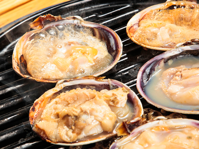 バーベキューコンロで焼き上げ豪快に頬張ると、閉じ込められた海の旨みが口いっぱいに広がる。
