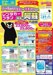熊本DC最初の週末に当たる7月6日(土)には、「日本旅行 団体貸切 オープニング記念号でくまモンと行く熊本への旅」を催行する。オープニング記念号には、熊本県PR営業部長兼しあわせ部長である“くまもん”が乗車し、「上天草女将会によるおもてなし」や「熊本県の名産品があたるじゃんけん大会」、「熊本現地食材を使ったDC特製弁当」、「熊本の名物おやつのお土産」など熊本の魅力的な観光素材を道中の車内で提供する。