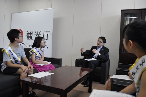 「観光により日本の文化や歴史を知り、地域でさまざまな体験をしてもらえば、互いの国を知ることで平和に、さらには日本経済の発展にもつながる」。子どもらは観光庁髙橋一郎次長と対面し、観光の意義などを教えてもらった。
