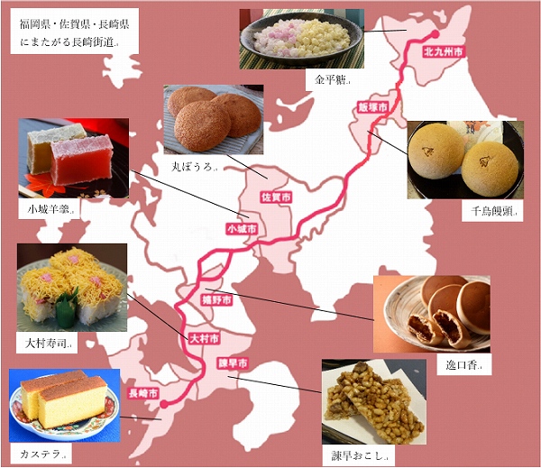 小倉と長崎をつなぐ全長228㌔の街道。室町時代末ごろから江戸時代にかけて行われた西洋や中国との貿易で、街道沿いの地域には砂糖や外国由来の菓子が多く流入し、独特の食文化を持ったといわれる。