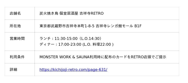 サ旅プランの楽しみのひとつとして、各施設の所在地付近の街歩きや飲食店がございます。同企画開催中にご案内可能なものとして、MONSTER WORK & SAUNAの利用者限定で、「炭火焼き鳥 個室居酒屋 吉祥寺RETRO」とのコラボメニューがご提供可能です。