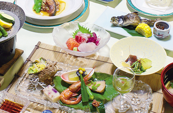 そして宿自慢の夕食では、すぐそばの日本海で獲れた鮮魚や地場の山菜、丹精込めて育てた農家の野菜など、厳選された素材の数々が食卓を彩る。このほか、各酒蔵自慢の地酒も豊富に揃い、言うことなしの贅沢なひとときに心もお腹も満たされるだろう。