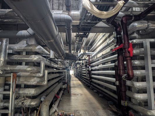 同館地下にある温泉設備は、国内最大級の規模を誇る。ここでは75度の源泉と水を熱交換して温度を調整しながら、浴槽やシャワーに適温で届ける工夫が施されているのだが、その制御はスタッフが毎日手動で管理しているという。