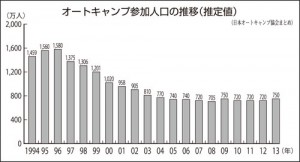 日本オートキャンプ協会(吉田章会長)がこのほど発表した「オートキャンプ白書2014」によると、13年のオートキャンプ参加...
