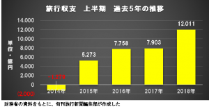 2018年8月13日(月) 配信 国際収支統計(速報、財務省)によると、2018年上半期の旅行収支は1兆2011億円...