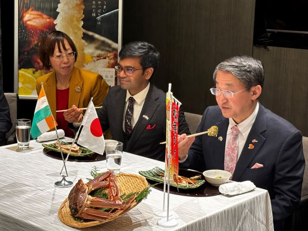 焼き松葉ガニの試食では、アッパル総領事が「エクストリーム・デリシャス!(極めておいしい)」と絶賛。会場からは拍手が起こり、和やかな雰囲気に包まれた。「インドでは海岸線エリアで魚介類を食べる習慣があり、カニは受け入れられる可能性がある」としたうえで、「水産分野における技術協力や、カニとカレーを組み合わせた新たな食の提案など、さまざまな展開が考えられる」と今後のビジネス展開に期待を示した。