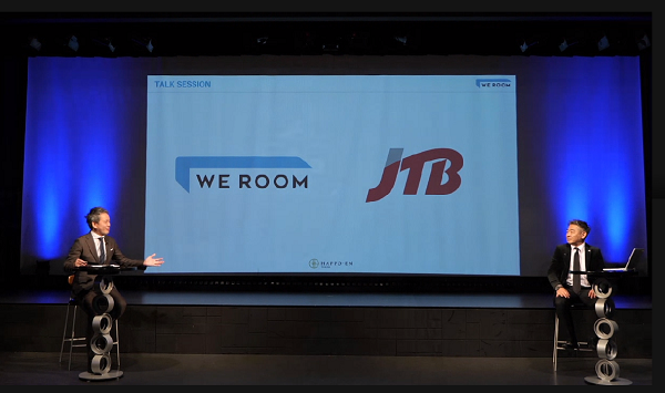 同日、WE ROOMを活用したメディア向け発表会を開いた。今後のオンラインイベントについて、八芳園の薮嵜正道取締役経営管理部長と、WE ROOMの活用実績があるJTB新宿第一事業部の坂井弘和氏の対談が行われた。