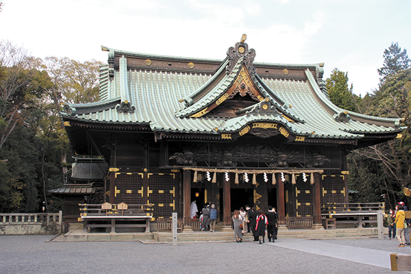 国指定重要文化財の本殿は1866(慶応2)年に建立。本殿、幣殿、拝殿の3つの建物が連なる複合社殿。総ケヤキ素木造り。正式参拝や御祈祷を執り行う。舞殿は1867(慶応3)年に建立。年間を通じ神事、奉納行事が執り行われる。神門も舞殿と同じく1867年に建立。芸能殿は旧総門。1930(昭和5)年の北伊豆地震で倒壊した後、芸能殿として現在の場所に移築された。総門は北伊豆地震の翌年に建立。門に架かるしめ縄は重さ400㌔、太さ2㍍、長さ6・4㍍もある。