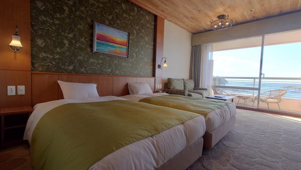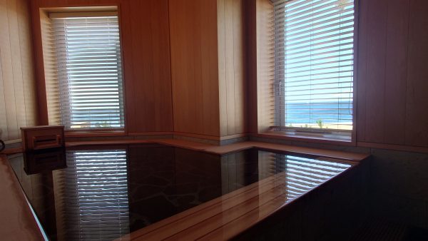 ホテル棟の客室は4タイプ60室、2―3階客室はオーシャンビューになっている。温泉はホテル棟内の貸し切り風呂に加え、隣接する温浴施設「SPASSO」でも楽しめる。同館には、内湯と、天然温泉が楽しめる要望露天風呂、サウナ、岩盤浴があり、ホテル棟の風呂と合わせ、湯巡りもできる。