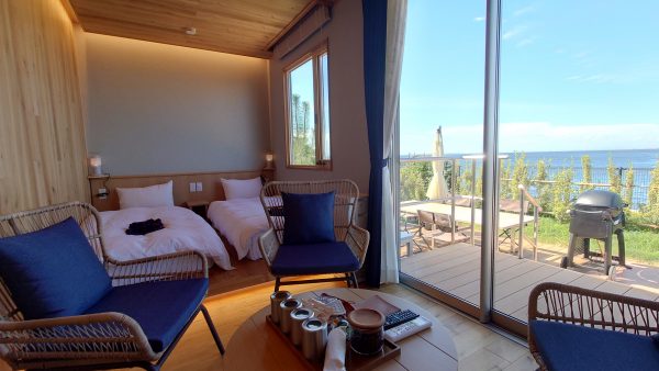 グランピング施設も、3室から15室に拡張した。グランピング施設の導入は同社初の試みで、観音崎の自然を最大限に感じてもらうのに最適であるとして導入を決定。各棟室内の窓やテラスから東京湾を一望でき、各棟に付随するテラスでは潮風を浴びながらバーベキューが楽しめる。