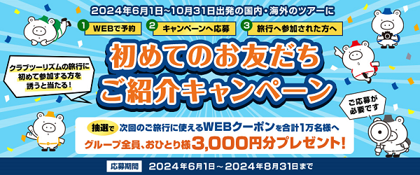 クラブツーリズム、友だち紹介CP 1万人に3000円分当たる(8月31日まで)