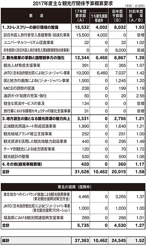 観光庁がまとめた2017年度の概算要求では、前年度予算比58%増の316億2800万円を求めた。ストレスフリーの旅行環境の整備に155億3200万円、観光産業の革新に123億4400万円、観光資源の魅力向上に33億3100万円、その他に4億2千万円。また、東北の復興枠として57億3500万円を求め、総額で同52%増の373億6300万円を要求した。訪日客の受入環境の整備と海外プロモーションが大きな額を占めるが、従来の規制・制度など抜本的な見直しや、地方創生に資する事業なども加速化させる。また、税制改正でインバウンド向けに酒税の免税制度の創設が要望された。