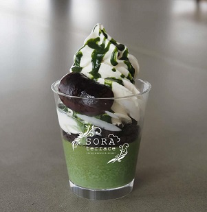 竜王マウンテンリゾート内にある「ソラテラスカフェ」では「ジャックと豆の木」の世界を楽しんでもらえる限定メニューを販売する。国産牛乳のソフトクリームを使った「豆の木抹茶ソフト」は「ジャックと豆の木」に出てくる「雲を抜けるツル」をイメージした限定スイーツ。宇治抹茶プリンの上に、雲をイメージしたふわふわ食感の国産牛乳のソフトクリーム。ツルは全体にかけた「宇治抹茶ソース」、ジャックが牛と交換した種は長野県産の花豆を添えて世界観を表現した。
