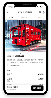 購入方法は、ライドパスアプリの検索欄から、「IKEBUS1日乗車券」または「イケバス1日乗車券」を検索。チケットを選択してから、人員や支払い方法を選択して購入できる。