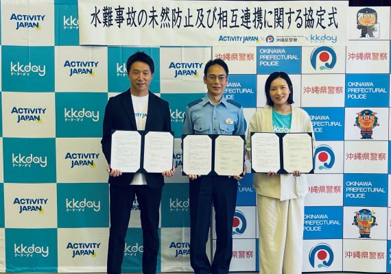 アジアでオプショナルツアー予約サイトを運営するKKDAY JAPAN(大淵公晴支社長、東京都新宿区)と同社のグループ会社で国内アクティビティ予約サイトを運営するアクティビティジャパン(陳明明社長、東京都新宿区)は7月16日(水)、沖縄県警察本部と訪日外国人を含む観光客の水難事故防止に向けた三者連携協定を結んだ。安心・安全な観光体験の提供と持続可能な観光地づくりを目指す。