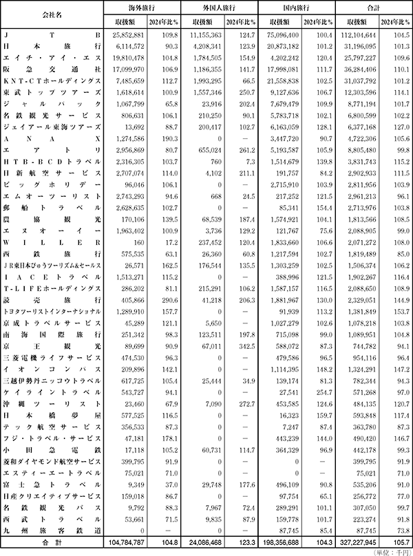 なお、JTB、エイチ・アイ・エス、KNT-CTホールディングス、日本旅行、阪急交通社、T-LIFEホールディングス、WILLER、エアトリについては、グループ総計の数値のみを公表した。