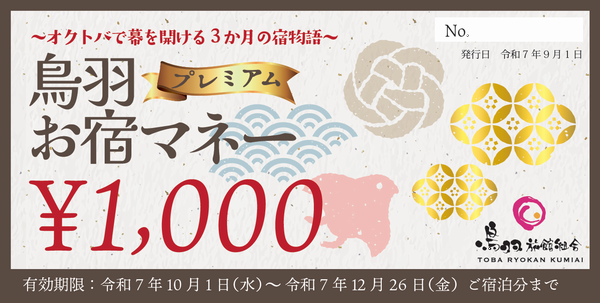 三重県鳥羽市の鳥羽旅館組合は8月1日(金)、加盟旅館で利用できる20%のプレミアム付き商品券「鳥羽プレミアムお宿マネー」を売り出した。鳥羽で10月からイベントを開催する「オクトバ」事業の一環として発行し、秋から冬にかけての来訪促進と宿泊需要の拡大をはかる。商品券の販売はなくなり次第終了となる。