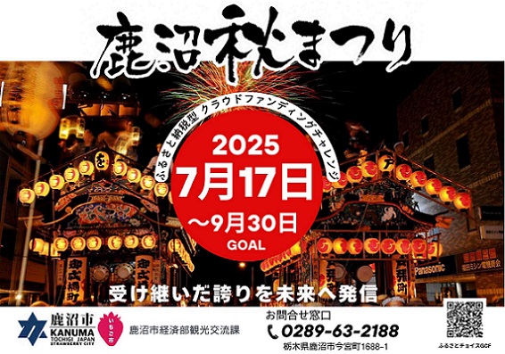 鹿沼秋まつりふるさと納税型クラウドファンディングの寄付募集期間は2025年7月17日~9月30日(76日間)、目標金額は400万円。