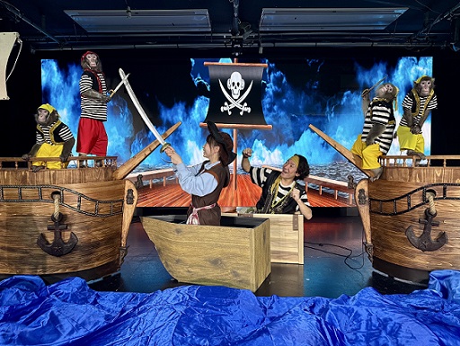 メインステージ「パイレーツオブモンキー」劇場参加型プレミアムシートは、来場者がおさる海賊団の一員としてステージに登場できる初の参加型ショー。ステージ上で、おさるたちと戦ったり逃げたりといったドタバタ劇を一緒に演じ、臨場感たっぷりの体験が楽しめる。参加者には「おさる海賊団クルー認定証」をプレゼント。料金は3000円(税込)、公演は午後3時から(土日祝日、8月12日―15日)※1グループ1~2人まで。