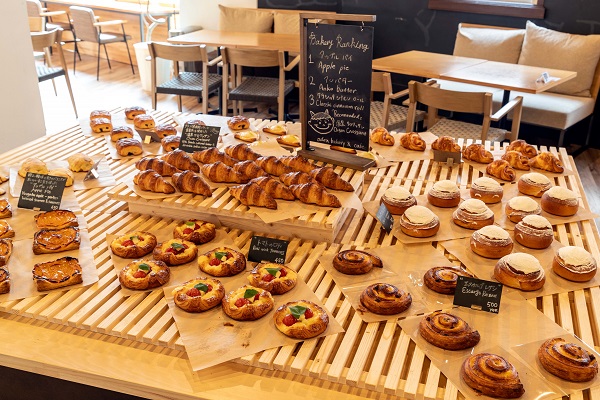 登別温泉初のベーカリー「adex BAKERY&CAFE」の店内には電源完備のカウンター席もあり、ゆったりと焼きたてのパンを楽しむ宿泊客や観光客でにぎわっている。今回、新たにフレンチとイタリアンの技法を融合させたパスタが登場。