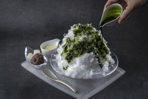 「翠雪華(すいせっか)」は、濃厚で奥行きのある香りが愉しめる抹茶と練乳の王道な組み合わせ。付け合わせの自家製あんこは北海道産の大納言小豆を使用。ある程度の小粒を残すことにより、小豆本来の風味と食感を堪能できるよう仕上げている。価格は2300円(同)。