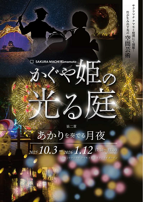 第1弾は2024年から25年にかけて実施され、延べ 1万3600人以上の来場者を記録した。同展は竹取物語のその後をテーマに、かぐや姫が帰った月の宮殿の庭を幻想的な竹あかりで表現する。第2章からの新たな取り組みとして、 光が動く仕掛けや、竹の打楽器で音を楽しむ参加型空間を設ける。さらに、和楽器などのパフォーマンスを週末やクリスマス期間などに実施する。