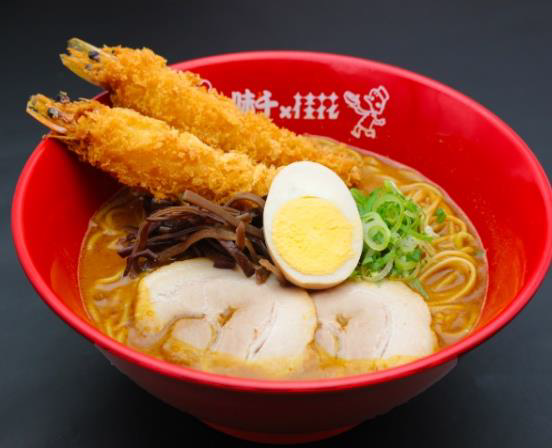 このうち、「味千×桂花 サクラマチ店」では、同アニメに登場するキャラクター「ニャンコ先生」の大好物である海老フライをトッピングした「大海老フライカレーラーメン(ミニライス付き)」を1480円で用意。味千ラーメンのスープをベースにした特製カレースープは、ミニライスとの相性が抜群だという。