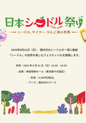 日本シードル祭り実行委員会(委員長=藤井達郎・上州沼田シードル醸造社長)は8月31日(日)、神田明神ホール(東京都千代田区)で「日本シードル祭り2025(SISGA JAPAN)」を開催する。リンゴを原料とした発泡酒「シードル」の認知度を高める狙い。