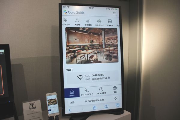 同社の製品は、客室のテレビから館内や観光名所の案内、浴場やレストランの混雑状況、コインランドリーの利用状況を発信するTVソリューション「Core TV」。同様のサービスを宿泊客のスマートフォンから閲覧でき、AIチャットボットや通話機能、最大100カ国語の言語に対応したスマホソリューション「Core Guide」を提供。