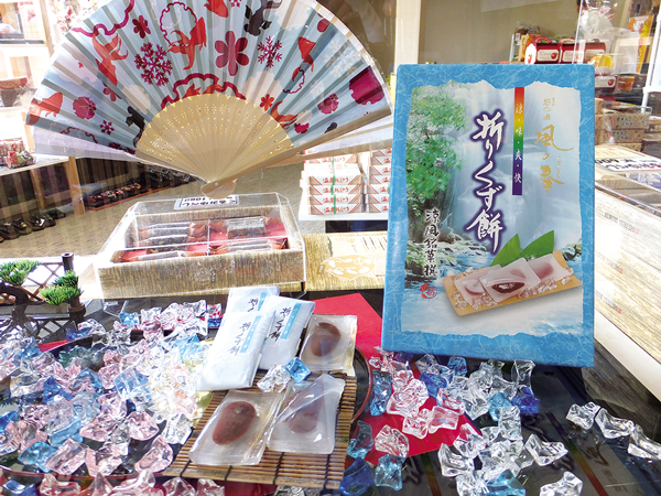 白山水系の清らかな水で炊き上げた上質の葛で、ほんのり塩味のこしあんを挟んだ折りくず餅。暑い夏には、冷やすとより一層美味しくいただける。お土産にも人気の一品だ(12個入680円、21個入1,100円)。