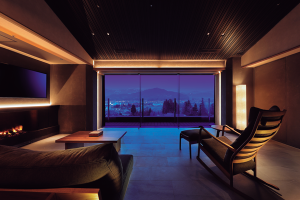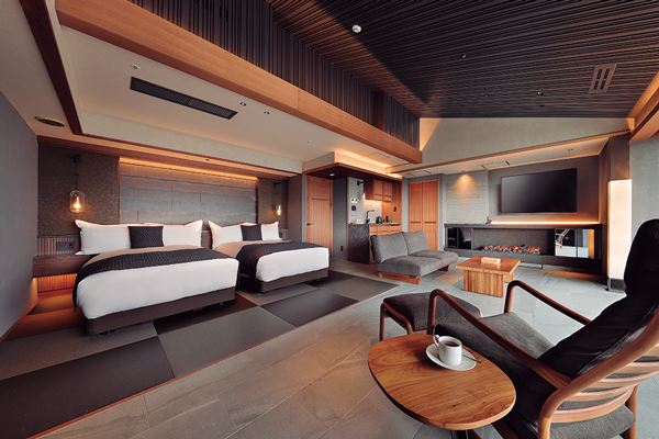 インテリアは、シックな黒を基調に落ち着きと洗練さを兼ね備えた和モダン空間。地元素材にこだわり、山形の自然・文化が随所に表現され、かみのやまの自然との共生を感じられる部屋となっている。