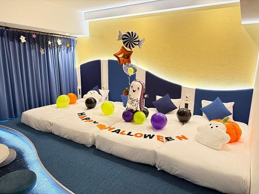 1つ目の「おばけとハロウィンパーティーを楽しむ」がテーマの部屋は、ハロウィンバルーンやおばけが飾られた可愛らしくて賑やかな装飾となっている。ローベッドのスーペリアルームで利用人数は3~4人と子供連れのファミリーにも最適だ。装飾のバルーンは持ち帰りもできる。