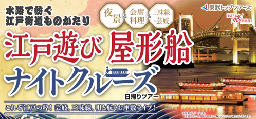 東武トップツアーズ(百木田康二社長、東京都墨田区)は9月21日(日)、10月26日(日)、11月29日(土)の3日間、「江戸遊び屋形船ナイトクルーズ」日帰りツアーを実施する。お台場と東京スカイツリーを間近で見られる人気の高いコースを屋形船で周遊し、津軽三味線と唄に、船から見える東京の景色を楽しめるツアーを販売している。