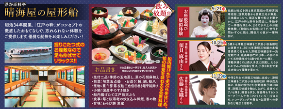 Aコースは、出発日が9月21日(日)で午後4時に吾妻橋乗船場集合。芸妓によるお座敷遊び疑似体験として、浅草見番から芸妓3人が乗船し、江戸の粋と所作を間近で味わい、三味線の演奏と踊りを楽しめる。