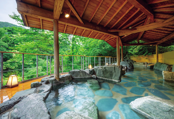 大浴場は、手付かずの自然を眺望する造りで、自家源泉から湧き出る弱アルカリ性単純泉のやさしい温泉を、子供から年配の方まで安心して満喫できる。