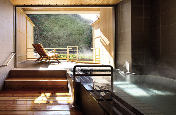 女神の貸切風呂「湯野~YUNO~」はバリアフリーの内湯と露天風呂をどちらも楽しむことができる。家族やグループでプライベートな空間と雄大な自然を満喫したい。