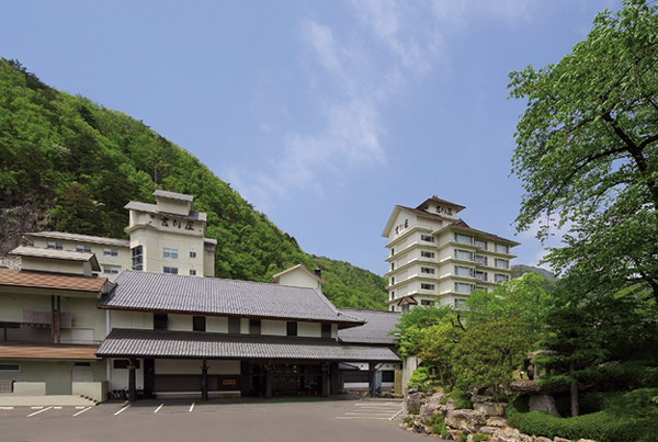 天保12年創業の老舗温泉旅館「吉川屋」。飯坂温泉駅より2㎞上流の摺上川沿いに位置する、自然豊かな山紫水明の別天地の宿だ。