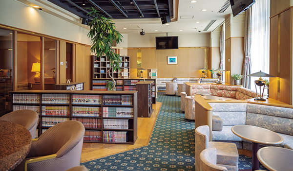 4000冊の漫画が楽しめるブックラウンジ「ふくろう」。漫画好きの社長が厳選した名作が並び、ゆったりとくつろげる空間が広がる。キッズスペースには、旅館内最大級の幅5m高さ3mのボルダリングを設置。子供が思いっきり遊べる、家族連れにうれしい施設だ。