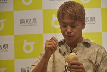 梨パフェを味わった武尊さんは「生クリームと梨が合う。めっちゃ美味しい」と笑顔でコメントし、平井知事も「二十世紀梨と大山牛乳の組み合わせはパーフェクト」と太鼓判を押した。