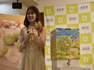 蛇口から梨ジュースを試飲した川口葵さんは「蛇口から好きなだけジュースを注いでみたかったので嬉しい。そのまま食べる梨はシャキシャキであっさりして美味しいけれど、ジュースにすると味が濃くて一気飲みしたくなる」と感想を語った。