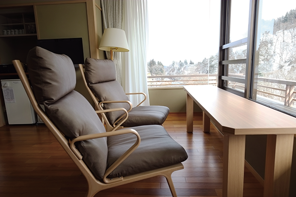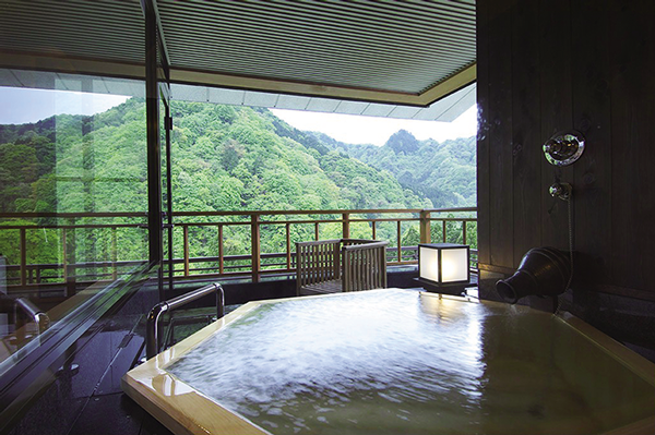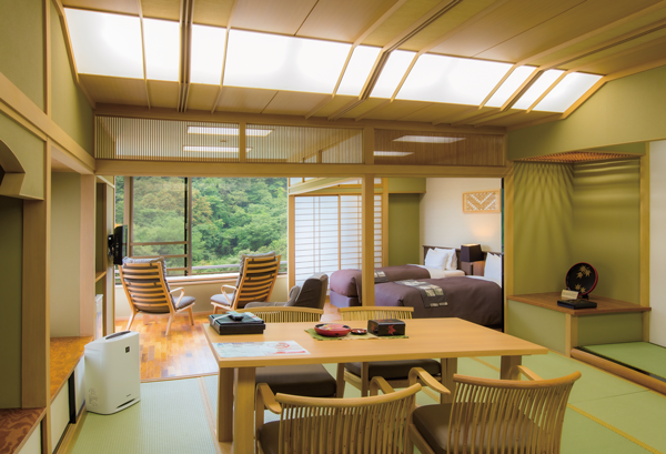 日光東照宮まで徒歩5分の純和風旅館「日光千姫物語」。なかでも「特別室」は、東南向きの窓から望む山と大谷川の大パノラマの眺望が人気。展望ソファでくつろげば、時の経過を忘れてしまうほど贅沢なひとときを過ごすことができるだろう。
