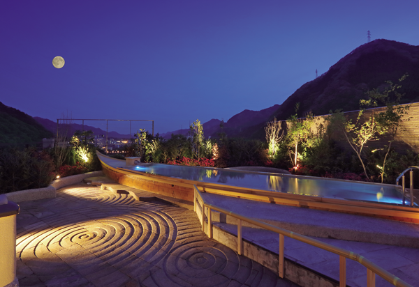秀峰館の空中庭園露天風呂は、鬼怒川温泉で最も高い場所にあり、夜には満天の星が、昼間は眼下に広がる鬼怒川渓谷の絶景が一望できる。効能豊かな自家源泉「子宝の湯」は、大浴場だけでなくすべての客室で堪能でき、心も身体も癒される。貸切風呂「吉祥 打ち出の小槌の湯」では黒御影石の浴槽の「宝珠」、岩の浴槽の「宝鍵」、檜の浴槽の「丁子」、赤御影石の浴槽の「隠笠」から選んで楽しめる。