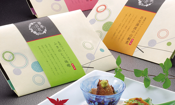 料理長が丹精こめて作った「ふきのとう味噌」、「日光湯波の山椒煮」、「柚子胡椒」は、会席料理でも提供される人気の逸品。オリジナルのブルーベリーアイスやコンフィチュールなどもあり、地産地消の商品を作っている。売店やECサイトで販売しており、気軽に旅館の味を堪能できる。